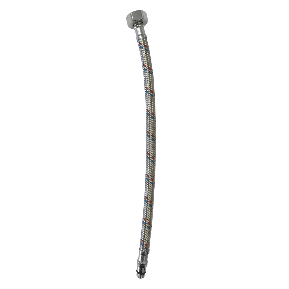 STAINLESS STEEL BRAIDED CONNECTOR, MALE AND FEMALE THREADS. FEMALE 15MMX10MM AND MALE 300MM. 5 YEAR MANUFACTURERS GUARANTEE.